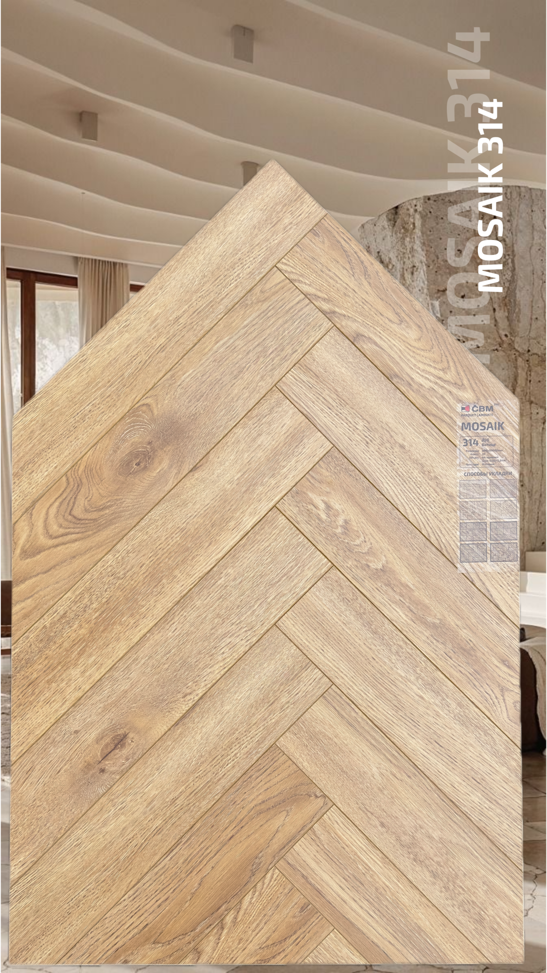 Страна производства Чехия Коллекция Mosaik Класс пожарной опасности КМ 3 Производители ламината Cbm Класс ламината 33 Толщина доски ламината 10 мм Размеры доски ламината 600х100 мм Вид\Имитация материала Ёлочка Упаковка ламината 2,64 м2, досок (22А+22В), 23,4 кг. Наличие фаски ламината 4х-сторонняя Влагостойкость ламината Повышенная Срок эксплуатации ламината (в домашних условиях) 25 лет -